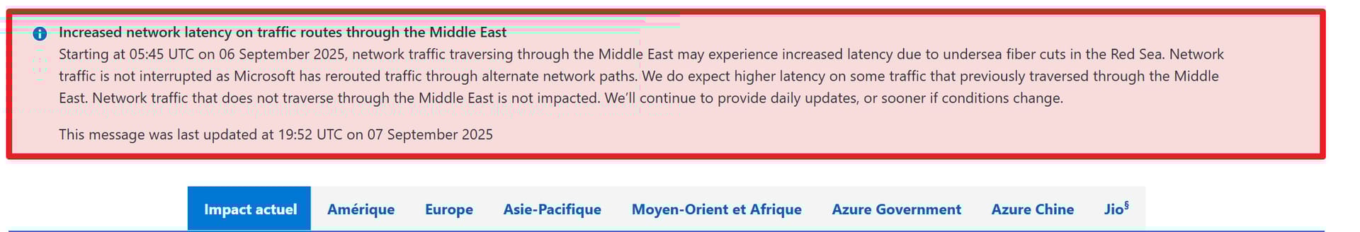 Microsoft confirme un incident affectant plusieurs cรขbles sous-marins dans la mer Rouge. Cet รฉvรฉnement a provoquรฉ une hausse de latence sur certaines routes rรฉseau, sans interruption totale des services Azure.